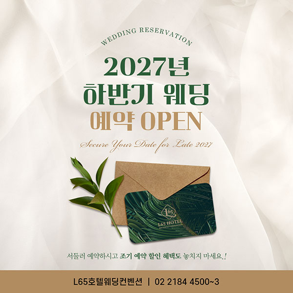2027년 하반기 웨딩 예약 OPEN 2027년 하반기 웨딩 예약 시작합니다. 서둘러 예약하시고 할인 혜택 받으세요~ 기간 2026/03/21 ~ 계속 내용 보기 본식원판, 본식스냅 & 본식영상 스페셜 프로모션 하이퀄러티 본식원판, 본식스냅 및 영상을 특별 할인된 가격으로 만나 보세요. 기간 2026/01/05 ~ 계속 대상 신규 계약자 및 2026년~2027년 기존 모든 계약자에 혜택 적용 내용 보기 2025 송년모임 예약 받습니다. 소중한 분들과 함께 한해의 마무리와 새로운 시작을 L65호텔웨딩컨벤션과 함께하세요. 기간 2025/09/25 ~ 계속 내용 보기 매주 화요일 정기 휴무 휴무일을 확인하시어 방문에 착오없으시길 바랍니다. 기간 2024/06/12 ~ 계속 내용 보기 1