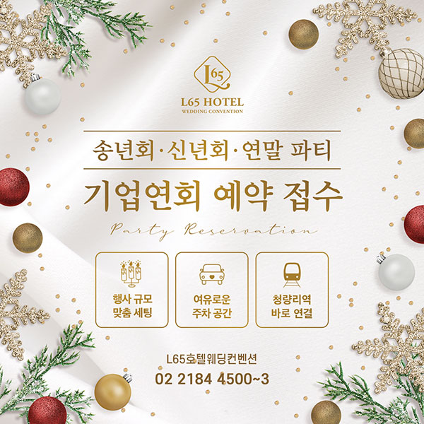 2025 송년모임 예약 받습니다. 소중한 분들과 함께 한해의 마무리와 새로운 시작을 L65호텔웨딩컨벤션과 함께하세요. 기간 2025/09/25 ~ 계속 내용 보기 2026년 하반기 웨딩 예약 OPEN 2026년 하반기 웨딩 예약 시작합니다. 서둘러 예약하시고 할인 혜택 받으세요~ 기간 2025/04/09 ~ 계속 내용 보기 매주 화요일 정기 휴무 휴무일을 확인하시어 방문에 착오없으시길 바랍니다. 기간 2024/06/12 ~ 계속 내용 보기 1