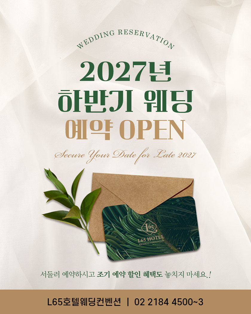 이벤트 상세 혜택 2027년 하반기 웨딩 예약 OPEN 2027년 하반기 웨딩 예약 시작합니다.서둘러 예약하시고 할인 혜택 받으세요~ 이벤트 기간 : 2026/03/21 ~ 계속 TEL : 02-2184-4500~3 이벤트 혜택 자세한 사항은 예약실로 문의주세요.예약문의 02-2184-4500~3 이벤트 기간 2026/03/21 ~ 계속 목록 이전 이벤트 이전 이벤트가 없습니다. 다음 이벤트 본식원판, 본식스냅 & 본식영상 스페셜 프로모션