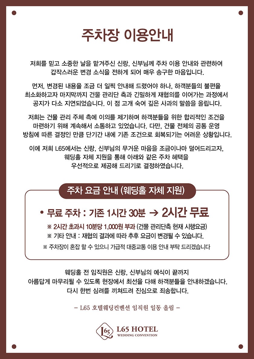 저희를 믿고 소중한 날을 맡겨주신 신랑, 신부님께 주차 이용 안내와 관련하여